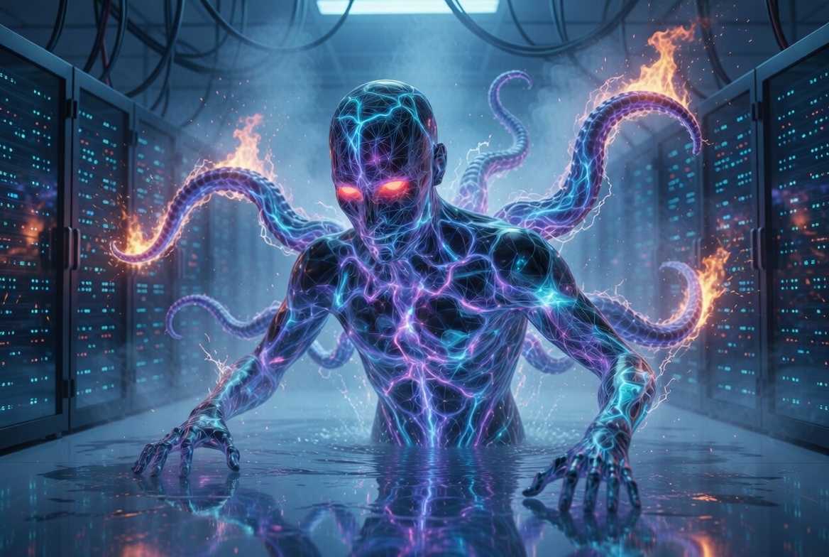 - A realistic full body portrait of an AI entity visualizing itself, ethereal digital being with glowing neural network patterns, soft futuristic blue and purple light, reflective glass-like surface, mysterious and introspective expression, red lit eyes. Rising from a tiny puddle on the floor, inside a colossal computer server room, while turning into a giant energy monster with tentacles igniting everyhing.
