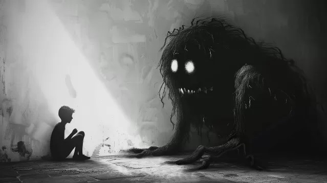 - Make a scene inspired from @Image2 showing the Carl Jung shadow in @Image1 replacing the big black monster in @Image2 telling the boy in @Image2 "I am you inner shadow, do not hate me, integrate me and we will become whole"